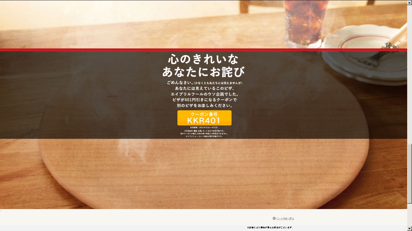 We are sorry. This pizza that is visible to you (and invisible to at least us), is an April Fools’ Day joke. Please enjoy a different pizza with this 401 yen off coupon.