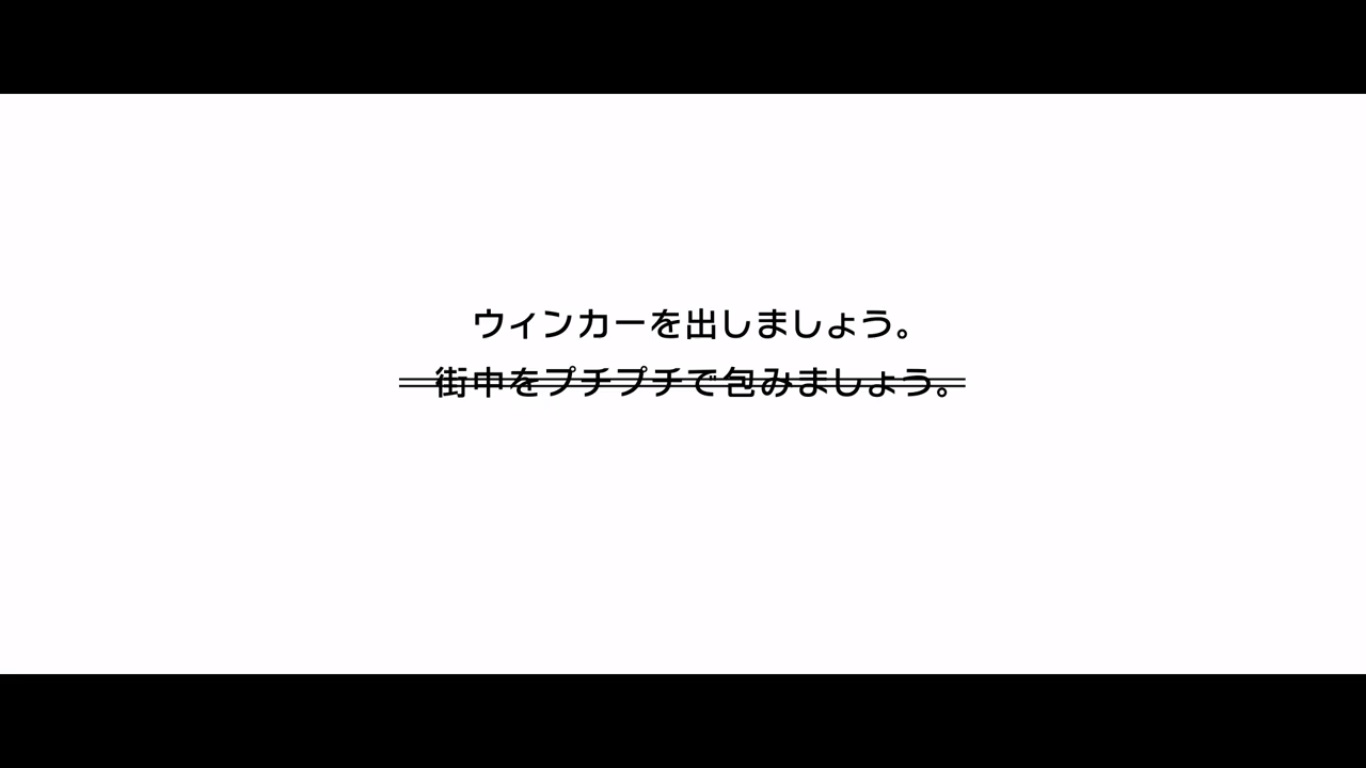 The video ends by stating that perhaps this kind of drastic measure is necessary to stay safe in a place where on average a traffic accident occurs every 50 minutes. The video then proposes that people in Okayama cover their towns in bubble wrap. Thankfully, this message gets crossed out and then a new message comes on screen asking people to use their turn signals.