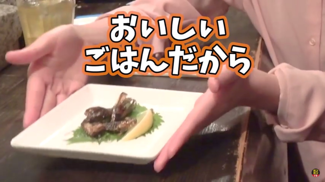 Prepared karage style (deep fried), this dish comes with scissors, which you use to cut it into more manageable pieces. As for the flavor, both Ricchan and Yocchi end up liking it. They remark that it tastes a lot life fish. In fact, Ricchan compares its flavor specifically to that of shishamo smelt.
