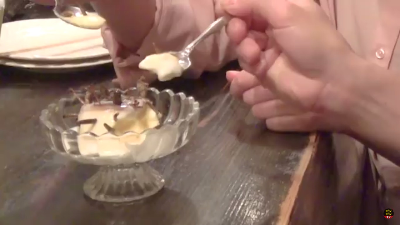 After they finish the cockroaches Ricchan says that she wants to eat something sweet, so they look at the menu and find a mysterious dessert item called “Pudding with foreign contaminants.” The description for this pudding says that it is “super popular” and that they cannot disclose what the “contaminants” in the pudding are. Ricchan and Yocchi decide to try it out and what they get is a pudding filled with mealworms and crickets.